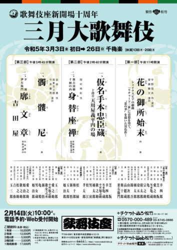 公演情報)3月歌舞伎座:亀蔵This entry was posted in 坂東亀蔵スケジュール 情報 on 2023年2月1日 3月歌舞伎座「三月大歌舞伎」 <第一部>と<第二部>に亀蔵が出演いたします <第一部> 午前11時00分開演 一、花の御所始末 足利義嗣 :亀 蔵 <第二部> 午後2時40分開演 一、仮名手本忠臣蔵 十段目 竹森喜多八 :亀 蔵 歌舞伎座「三月大歌舞伎」公演 3月3日(金)初日〜26日(日) 千穐楽 ※休演日:13日(月)・20日(月) 公演詳細はこちら