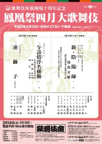 出演情報)4月歌舞伎座:亀蔵This entry was posted in 坂東亀蔵スケジュール 情報 on 2023年2月6日 4月歌舞伎座「鳳凰祭四月大歌舞伎」 <夜の部>に亀蔵が出演いたします <夜の部> 午後4時00分開演 二、連獅子 僧蓮念 :亀 蔵 歌舞伎座「鳳凰祭四月大歌舞伎」公演 4月2日(日)初日〜27日(木) 千穐楽 ※休演日:10日(月)・17日(月) 公演詳細はこちら