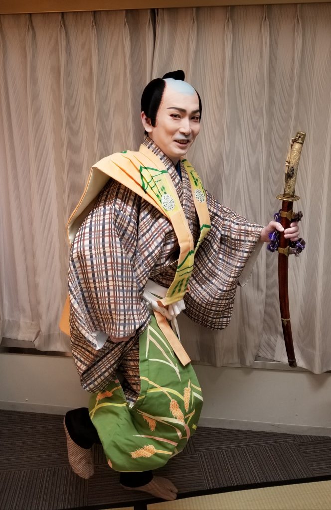 太刀盗人:亀蔵This entry was posted in 坂東亀蔵ブログ on 2018年8月12日 日生劇場は本日千穐楽でした。 子供達の夏休みの思い出に少しはなったかな? 普段の客席とは違う雰囲気が楽しかったです。 来月は歌舞伎座に出演しますので、それまでは束の間の夏休み。 写真は「太刀盗人」の田舎者。 訴訟叶って土産物を市場に買いに、大事な太刀を持ってウキウキでむかう所です。