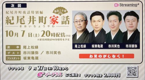 紀尾井町家話第百二十夜:亀蔵This entry was posted in 坂東亀蔵スケジュール 情報 on 2023年10月1日 「紀尾井町家話第百二十夜」に亀蔵が出演いたします。 席亭:尾上松緑 出演:市川猿弥・市川笑也 アシスタント:坂東亀蔵 10月7日(土)20:00より配信(予定) 詳しくはこちらをご覧ください。 配信チケットはこちらよりお求めください。