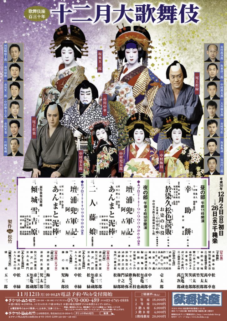 12月歌舞伎座出演情報更新This entry was posted in 坂東亀蔵スケジュール 坂東彦三郎スケジュール on 2018年11月17日 彦三郎・亀蔵が出演いたします。 12月2日(日)初日〜26日(水)千穐楽 <昼の部> 二、於染久松色読販 山家屋清兵衛:彦三郎 髪結亀吉:亀蔵 <夜の部> 一、壇浦兜軍記 阿古屋 秩父庄司重忠:彦三郎 榛沢六郎:亀蔵 公演詳細はこちら