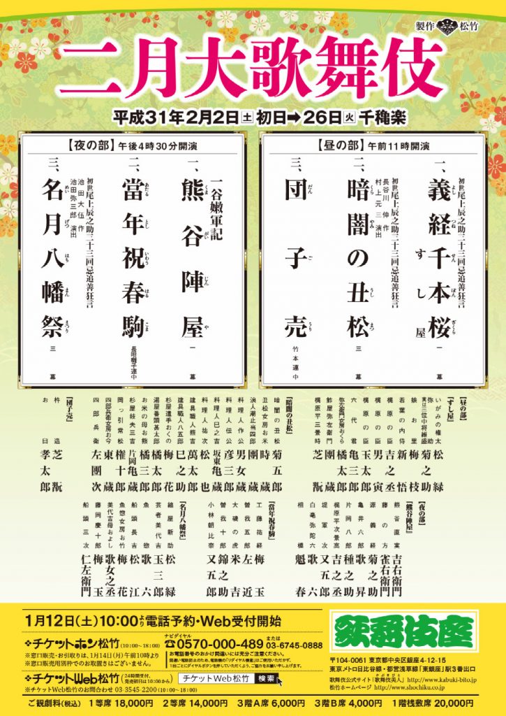 2月歌舞伎座:彦三郎・亀蔵・亀三郎This entry was posted in 坂東亀蔵スケジュール 坂東彦三郎スケジュール on 2018年12月24日 彦三郎・亀蔵・亀三郎が出演いたします。 2月2日(土)初日〜26日(火)千穐楽 <昼の部> 一、義経千本桜 すし屋 六代君:亀三郎 二、暗闇の丑松 料理人伝公:彦三郎 料理人巳之吉:亀蔵 公演詳細はこちら