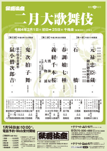 2月歌舞伎座:彦三郎・亀蔵This entry was posted in 坂東彦三郎スケジュール on 2022年1月5日 2月歌舞伎座 <第三部>に彦三郎・亀蔵が出演いたします。 <第三部> 二、鼠小僧次郎吉 早瀬弥十郎:彦三郎 与之助 :亀蔵 歌舞伎座「2月大歌舞伎」公演 2月1日(火)初日〜25日(金) 千穐楽 ※休演日:8日(火)・17日(木) 公演詳細はこちら