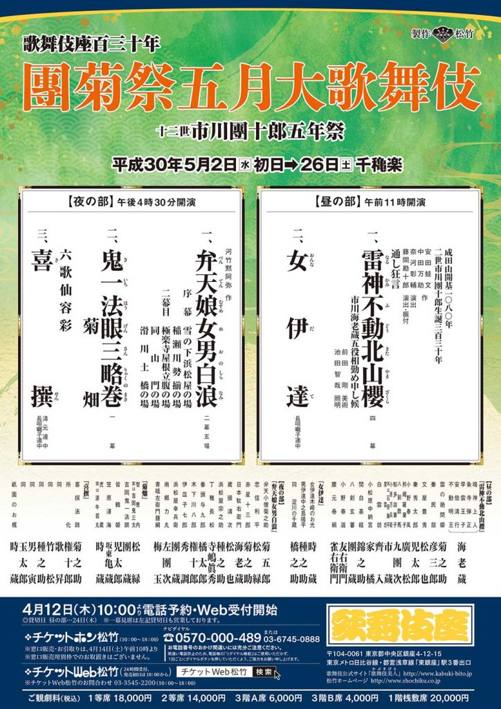 5月歌舞伎座:團菊祭五月大歌舞伎This entry was posted in 坂東亀蔵スケジュール 坂東彦三郎スケジュール on 2018年4月3日 彦三郎・亀蔵が出演いたします。 5月2日(水)初日〜26日(土)千穐楽 <昼の部> 一、雷神不動北山櫻 秦民部:彦三郎 <夜の部> 二、鬼一法眼三略巻 笠原湛海:亀蔵 公演詳細はこちら