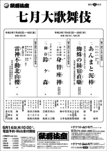 7月歌舞伎座:彦三郎・亀蔵This entry was posted in 坂東亀蔵スケジュール 坂東彦三郎スケジュール on 2021年6月8日 7月歌舞伎座 7月4日(日)初日〜29日(木)千穐楽 休演日:8日(木)・19日(月) 1部 蜘蛛の絲宿直噺に亀蔵 2部 鈴ヶ森に彦三郎が出演いたします。 詳細はこちらをご覧ください。