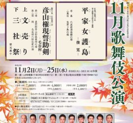 昼の部・夜の部共に彦三郎・亀蔵が出演いたします。 <昼の部> 一、たぬき 太鼓持ち蝶作:彦三郎 狭山三五郎:亀蔵 三、壇浦兜軍記〜阿古屋〜 秩父庄司重忠:彦三郎 <夜の部> 一、神霊矢口渡 新 […]